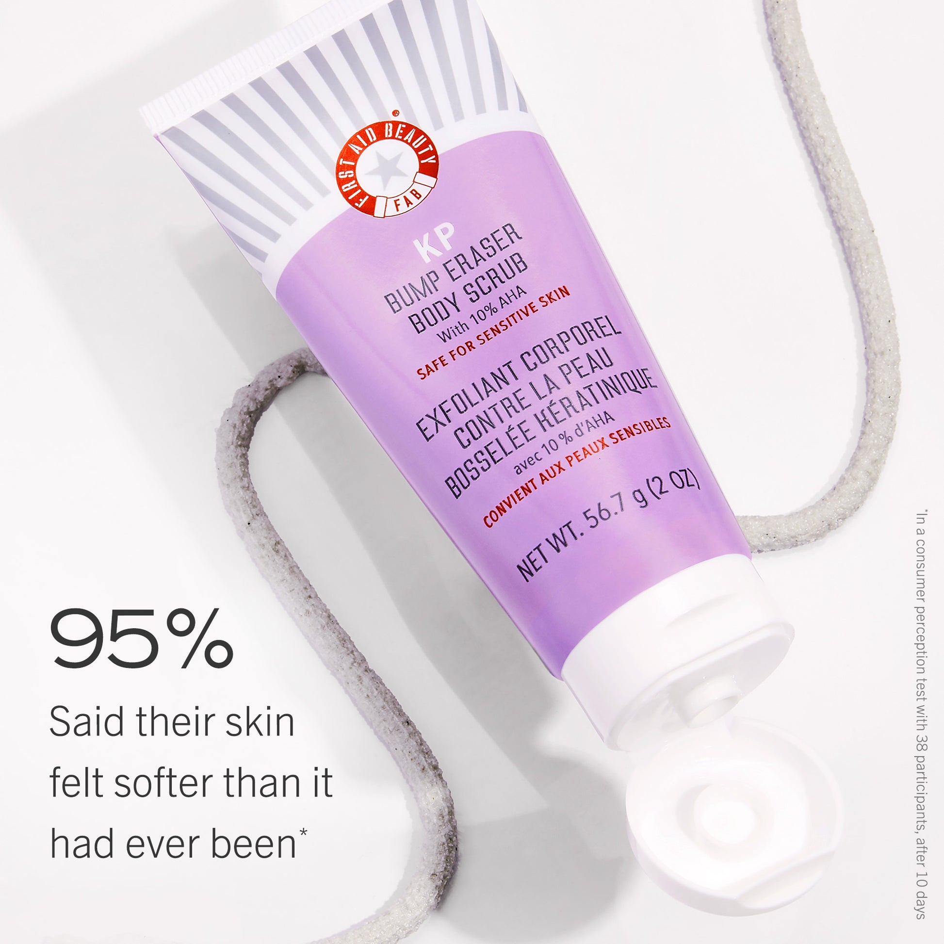 KP Bump Eraser Body Scrub: Pumice, Aqua/Water/Eau, Glycolic Acid, Sodium Cocoyl Isethionate, Lactic Acid,  Dimethicone, Stearic Acid, Cetearyl Alcohol, Sodium Hydroxide, Palmitic Acid, Glycerin, C12-15 Alkyl Benzoate, Sorbitol, Colloidal Oatmeal, Tocopherol, Chrysanthemum Parthenium (Feverfew) Extract, Camellia Sinensis Leaf Extract, Glycyrrhiza Glabra (Licorice) Root Extract, Salix Nigra (Willow) Bark Extract,  Bisabolol, Hydrogenated Coconut Acid, Xanthan Gum, Steareth-20, Steareth-21, Myristic Acid, Sodium Isethionate, Phenoxyethanol, Potassium Sorbate, Sodium Benzoate, Leuconostoc/Radish Root Ferment Filtrate, EDTA